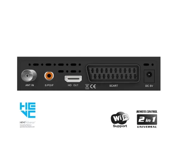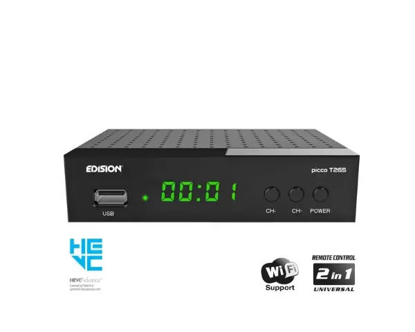 EDISION PICCO T265 Terrestrial Receiver, Full High Definition DVB-T2 receiver, with improved menu surfing and user experience.It has USB WiFi Support for Internet applications, 4-Digit LED Display, front panel buttons for Power ON/OFF and Channel -/+ plus Universal Remote Control 2-in-1 for the receiver and the TV, with four LG/SAMSUNG default settings which can be also programmable.EDISION PICCO T265 Terrestrial Receiver also has features PVR function and external IR port in order to connect a Jack-to-IR cable and make the receiver “invisible”! Your best TV friend, with more features from EDISION!
