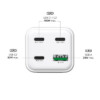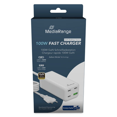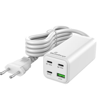 The MediaRange 100W GaN fast charging station is designed as a central charging solution for desks, workstations and home office environments. Equipped with a fixed 1.5m power cable, it provides flexible placement on desks or shelves and enables simultaneous charging of up to four devices via three USB-C ports and one USB-A port. Advanced GaN (Gallium Nitride) technology allows a compact and efficient design while significantly reducing heat generation during operation. Intelligent integrated chipsets continuously monitor charging power and temperature throughout the entire charging process to ensure stable, efficient and safe performance. The charging station supports latest fast charging technologies, enabling compatible devices to be charged efficiently according to their individual power requirements. It is suitable for charging smartphones, tablets, USB-C–powered laptops, wearables and other mobile devices. The charging station features a shock- and fire-resistant V0-rated polycarbonate housing and is Intertek GS certified, meeting high safety and quality standards for reliable everyday use in professional and private environments.
