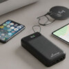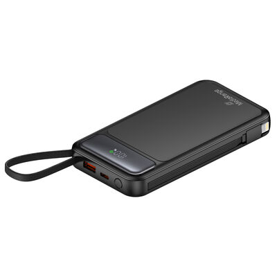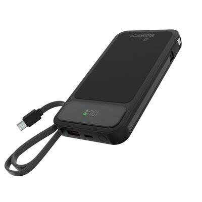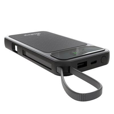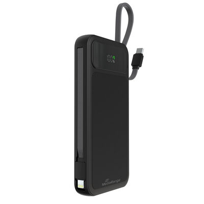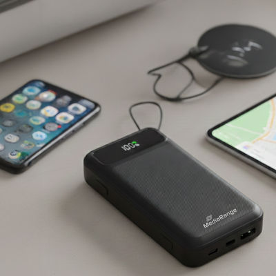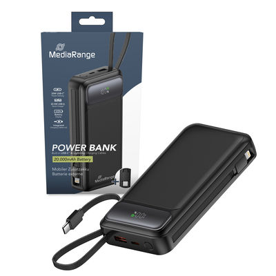 High-capacity 20,000mAh power bank with integrated charging cables. Supports fast charging and allows simultaneous charging of up to four devices. Ideal for extended mobile use and travel.Our 20,000mAh power bank provides a high-capacity and reliable power source for smartphones, tablets, smartwatches and other mobile devices. Integrated cables allow direct charging without additional accessories, making it ideal for longer trips and intensive daily use. Fast charging is supported via USB-C Power Delivery and USB-A Quick Charge. Compatible smartphones can be charged to approximately 60% within about 30 minutes under typical fast-charging conditions. Multiple output interfaces enable charging of up to four devices at the same time. When several devices are charged simultaneously, the available output power is shared. An integrated LC-Display shows the remaining battery capacity at a glance. A green indicator icon signals when fast charging is active. The compact and slim design makes the power bank easy to carry and suitable for everyday mobile use. With compact dimensions of 140×73×26mm and a total battery energy of 74Wh, the power bank is suitable for air travel within standard battery limits.