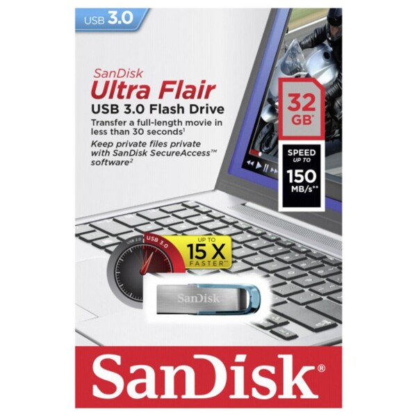 The SanDisk Ultra Flair 32GB USB 3.0 flash drive moves your files fast. Spend less time waiting to transfer files and enjoy high-speed USB 3.0 performance of up to 150MB/s. Its durable and sleek metal casing is tough enough to handle knocks with style. And, with password protection, you can rest assured that your private files stay private Store your files in style with the SanDisk Ultra Flair USB 3.0 flash drive.