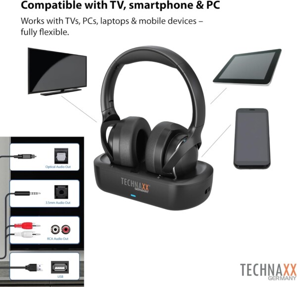 Wireless TV headphones for undisturbed viewing – perfect for seniors & hearing assistance: Enjoy clear and immersive sound from your TV without disturbing others. These over-ear wireless headphones are ideal for late-night watching, seniors, or anyone with hearing difficulties. Up to 30 hours battery life & fast USB-C charging via included base station. Dual mode functionality: TV mode via base station or Bluetooth mode for mobile devices: Connect to your TV using the base station (optical or 3.5mm AUX input), no pairing required. Switch to Bluetooth mode to enjoy music, podcasts or phone calls from your smartphone, tablet, or laptop. Built-in microphone for hands-free calls & intuitive on-ear controls:  The built-in mic makes the TX-350 ideal for working from home, Zoom calls or daily hands-free use.